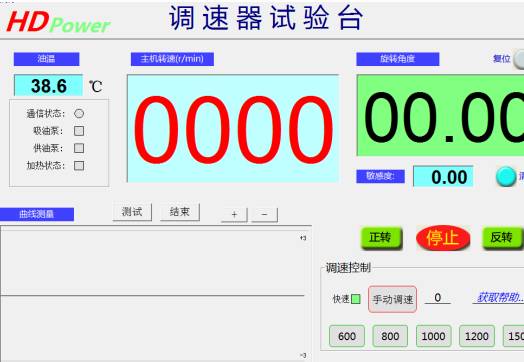 4、旋轉(zhuǎn)角度:輸出軸的轉(zhuǎn)動角度,在主驅(qū)動電機旋轉(zhuǎn)到需要轉(zhuǎn)速時,一只手按下停車按鈕(一直按,不松開),另一只手點擊電腦復位按鈕,(在保證調(diào)速器的調(diào)速狀態(tài)為“0”時),測試顯示旋轉(zhuǎn)角度為0,此時旋轉(zhuǎn)調(diào)速器的調(diào)速旋鈕,一直旋轉(zhuǎn)到大,看輸出軸的旋轉(zhuǎn)角度和出廠值對照是否合格,然后在旋轉(zhuǎn)到中間任何一個角度后,穩(wěn)定30秒左右,此時電機電腦屏幕“清零”按鈕,